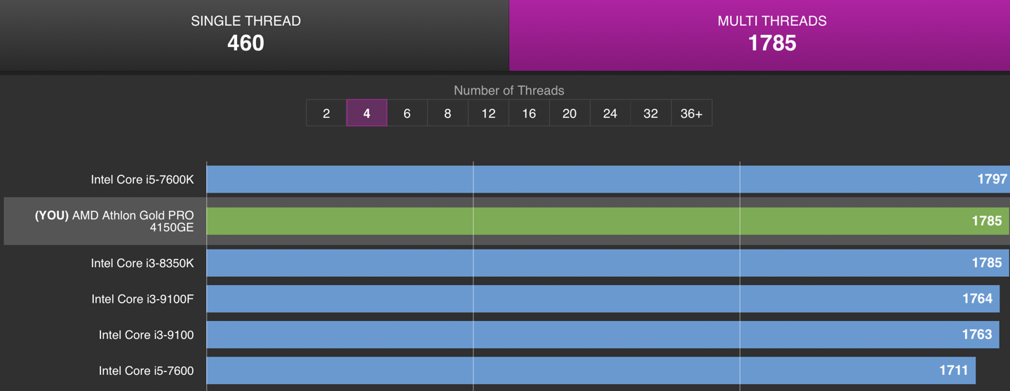 В Сети опубликован тест процессора Athlon Gold PRO 4150GE, который должен одновременно заменить Athlon Gold PRO 3150G и составить конкуренцию новейшему Intel Pentium G7400 поколения Alder Lake. Новинка хорошо показала себя в бенчмарке CPU-Z: в однопоточном тесте CPU заработал 460 баллов, в многопоточном – 1785 баллов. Как видно на графике, в многопотчном тесте Athlon Gold PRO 4150GE оказался даже быстрее Core i3-9100F.